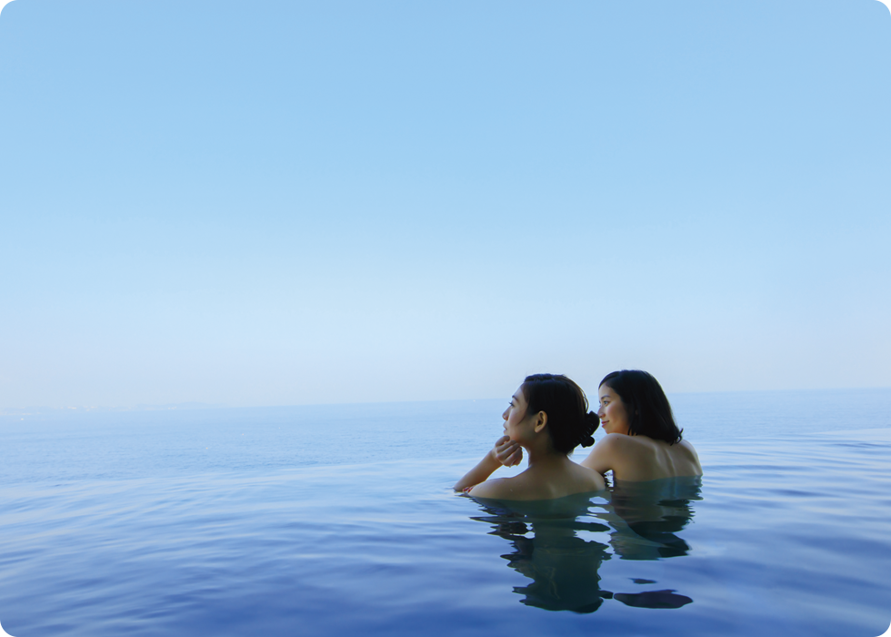 さらに歩いて熱海港へ。熱海港近くの日帰り温泉施設「オーシャンスパ Fuua」では、海が一望できる露天立ち湯や岩盤浴、リラクゼーション、カフェでくつろぐことができます。