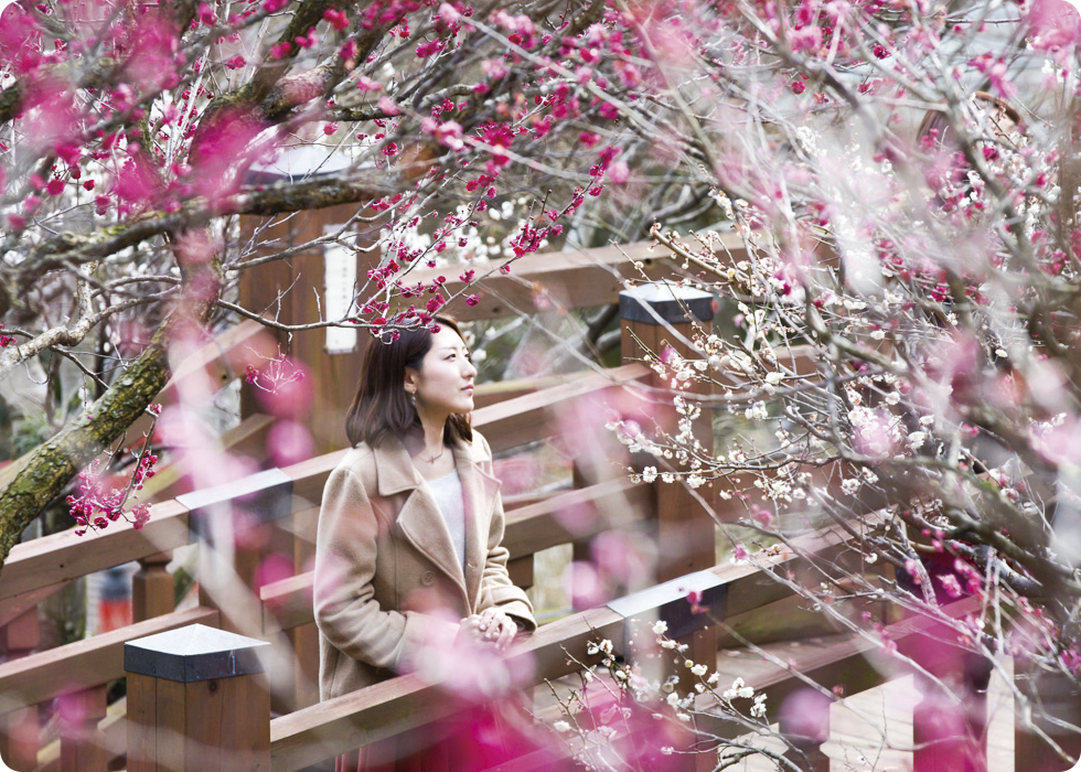 日本で最も早咲きの梅、そして最も遅い紅葉を見ることができると言われる熱海梅園。温泉につかり、適度な運動するのが体によいと提唱され、1886年(明治19年)に造成されました。温泉のまち、熱海ならではの文化です。