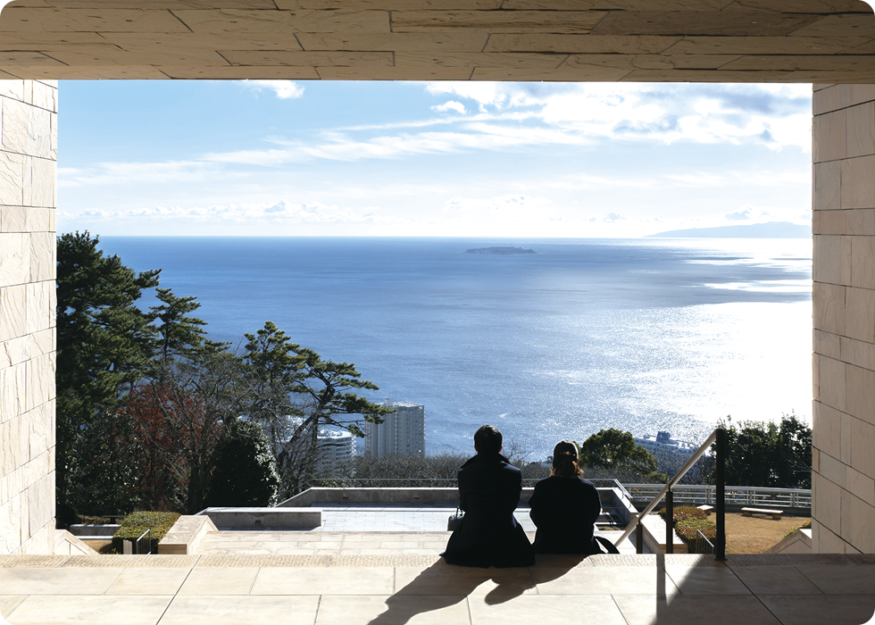 熱海の高台に建てられていて、館内のメインロビーやムア広場からは広大な海、伊豆大島や初島など、絶景が望めます。広大な敷地で、アートだけでなく、庭園が楽しめるのが魅力。館内カフェのスイーツや、庭園の茶室の和菓子も絶品。