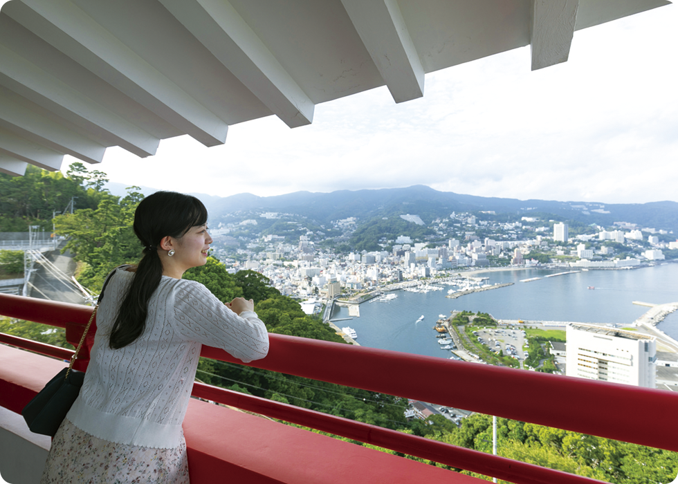 熱海港からロープウェイで山をのぼり頂上駅へ。頂上駅から歩いて3分の熱海城は、熱海のまちと海が一望できる絶景スポットです。隣には「熱海トリックアート迷宮館」もあり、ワイワイ楽しく過ごすのにぴったりの場所です。