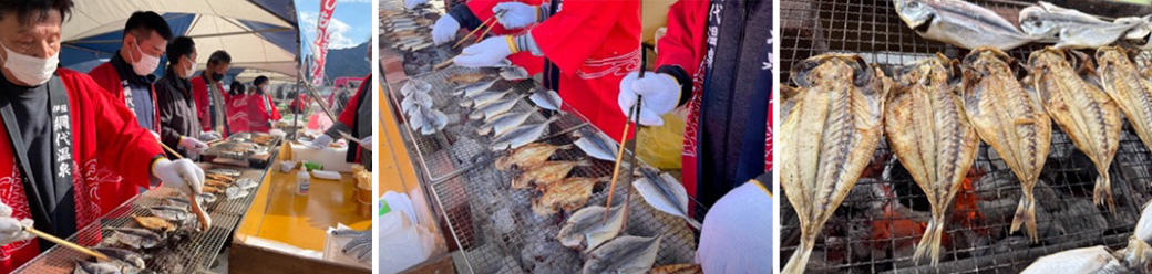 毎年11月から2月ごろに開催される網代の冬の風物詩「網代温泉ひもの祭り」。50周年の節目となる今回は、さらにパワーアップして開催されます。炭火で焼いたアジの干物は、脂が乗り、旨味が凝縮された絶品。各日2500枚が無料で振る舞われます。