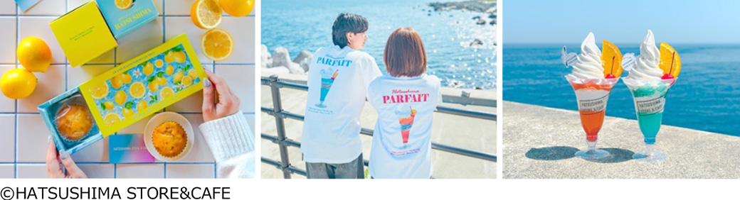 食堂街の一角にあるカフェ「HATSUSHIMA STORE&CAFE」では、2025 年春に誕生した初島発のオリジナル土産ブランド「#かわいい旅してきました」を手がけています。初島レモンを使ったお菓子や、トートバッグ、Tシャツ、オリジナルキャラクター「はつしまいるか」のグッズなど「かわいい」アイテムが揃います。カフェでは、大正時代から続く初島名産のところてんをアレンジした「初島パフェ」をぜひ。つるんとした食感と、さっぱりとした後味が人気の名物メニューです。