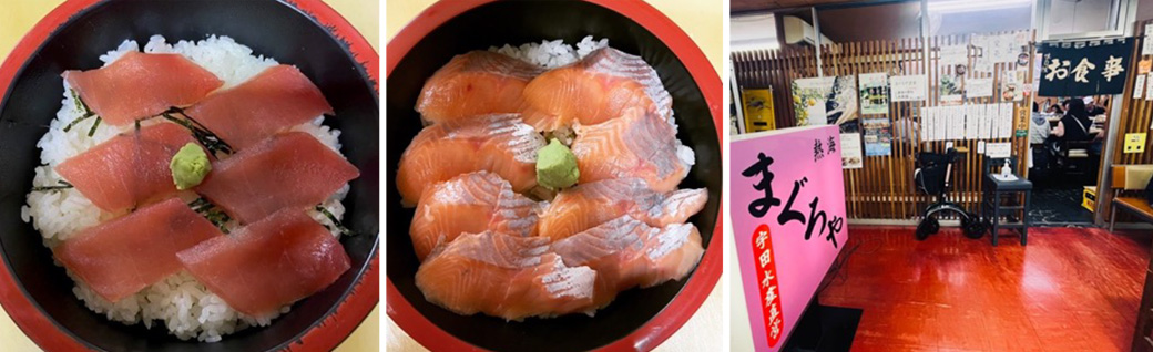 熱海駅前の熱海第一ビル地下にある「まぐろや」は、熱海魚市場代表も務める宇田水産の直営店。魚屋ならではのリーズナブルな価格で海鮮丼や魚介の定食を提供しています。毎朝市場から仕入れた魚をさばくのは、店主の宇田勝也さん。看板メニューのマグロ丼は800円、熱海特産・ダイダイの果汁を混ぜた餌で育てられた「熱海だいだいサクラマス」を使用した熱海マス丼は1200円でいただけます。くさみがなく脂の乗った逸品をたっぷり味わってください。