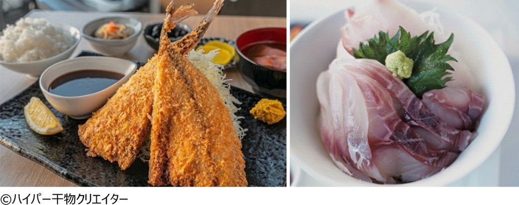 網代にある「干物屋ふじま」直営の「yoshi-魚-tei」は、オンラインストアで約1年待ちという「ハイパー干物クリエイター」藤間義孝さんの干物が食べられるお店。中でもおすすめは、ランチ限定の「干物屋さんのアジフライ定食」。塩分や天日干し時間を調整した専用の干物で作るアジフライは、干物屋ならではの逸品です。このほか、熱海の旬の地魚を使った丼や、2025年オープンの姉妹店「sumibi steak 藤間」でいただける「天然本まぐろ大トロ天日干し」「熟成トロサーモン塩麹天日干し」もぜひ。